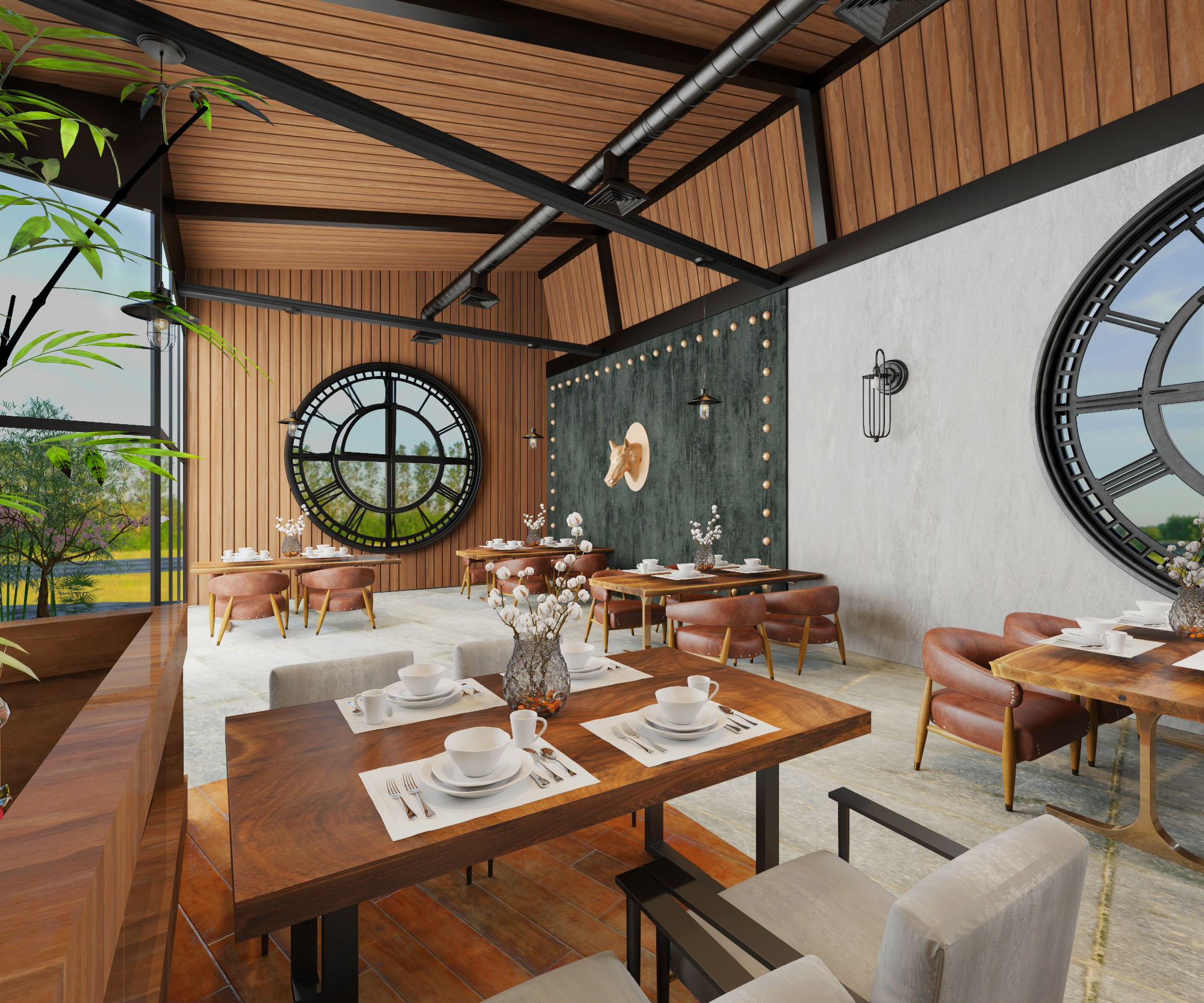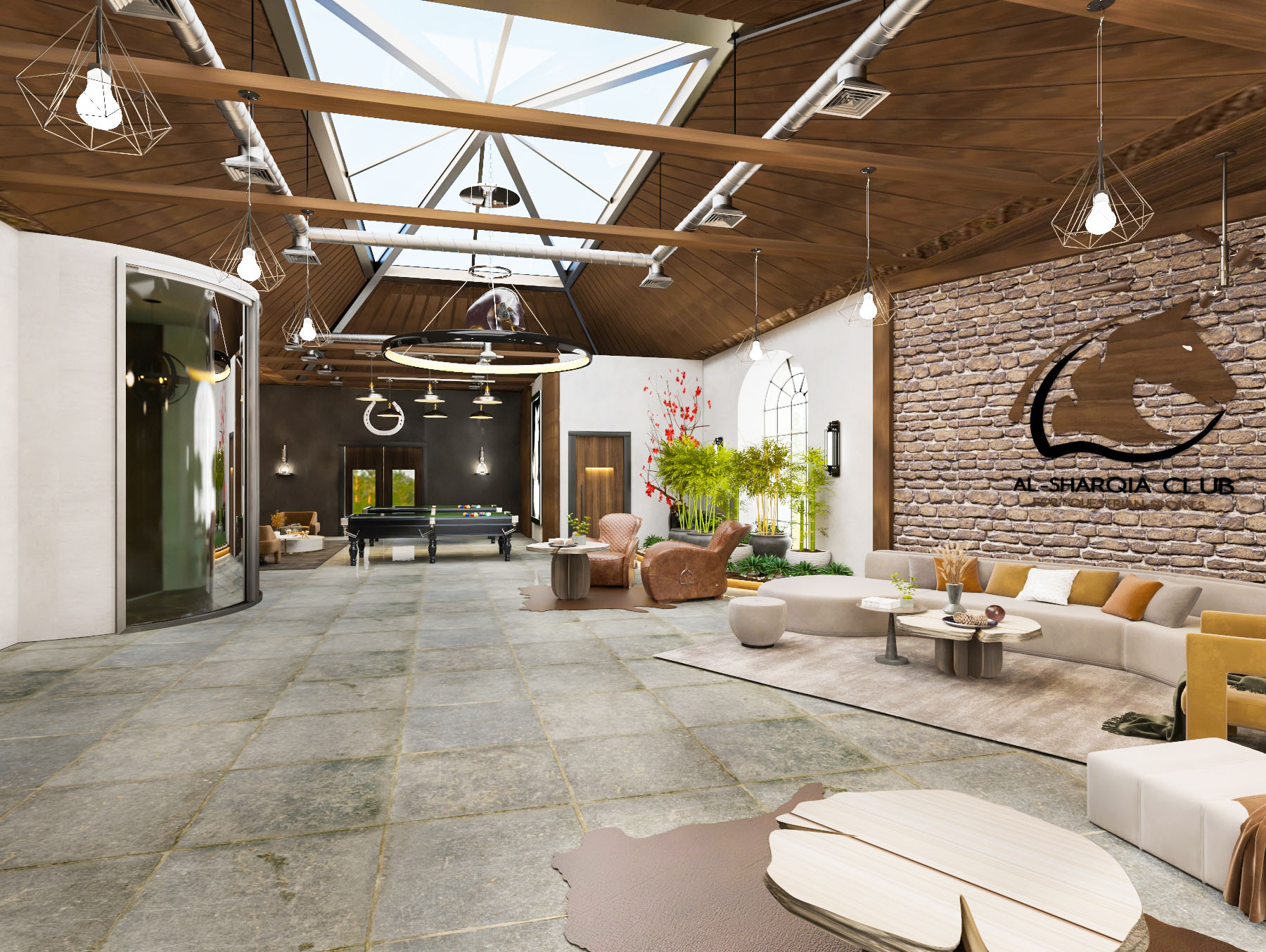 The project’s concept identifies to an authentic atmosphere which reflects horse stables by using natural materials like (wood, bricks, stones, natural leather and metal) with the combination of warm colors to make a soothing mood. Furthermore, the usage of horses’ equipment and tools in the design of the club reflects the mood of the stable. Also the usage of Al-Sharqia materials to achieve the place identity.