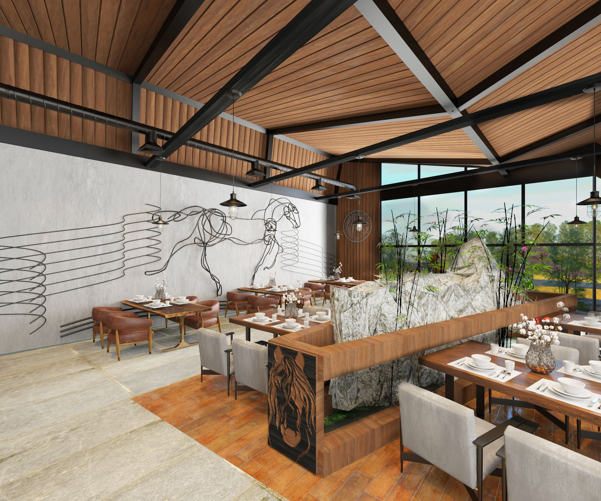 The project’s concept identifies to an authentic atmosphere which reflects horse stables by using natural materials like (wood, bricks, stones, natural leather and metal) with the combination of warm colors to make a soothing mood. Furthermore, the usage of horses’ equipment and tools in the design of the club reflects the mood of the stable. Also the usage of Al-Sharqia materials to achieve the place identity.